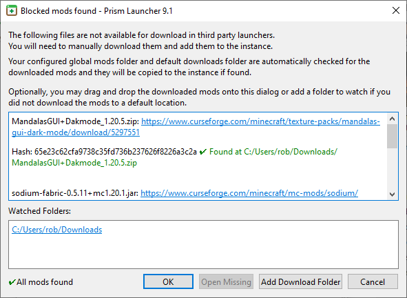 There are a few mods which Prism Launcher is unable to download automatically. For these three mods, click on the links to open the page in your browser and download them into your "Downloads" folder. Once they are there, Prism Launcher will show "All mods found" and you can click "OK" to proceed.