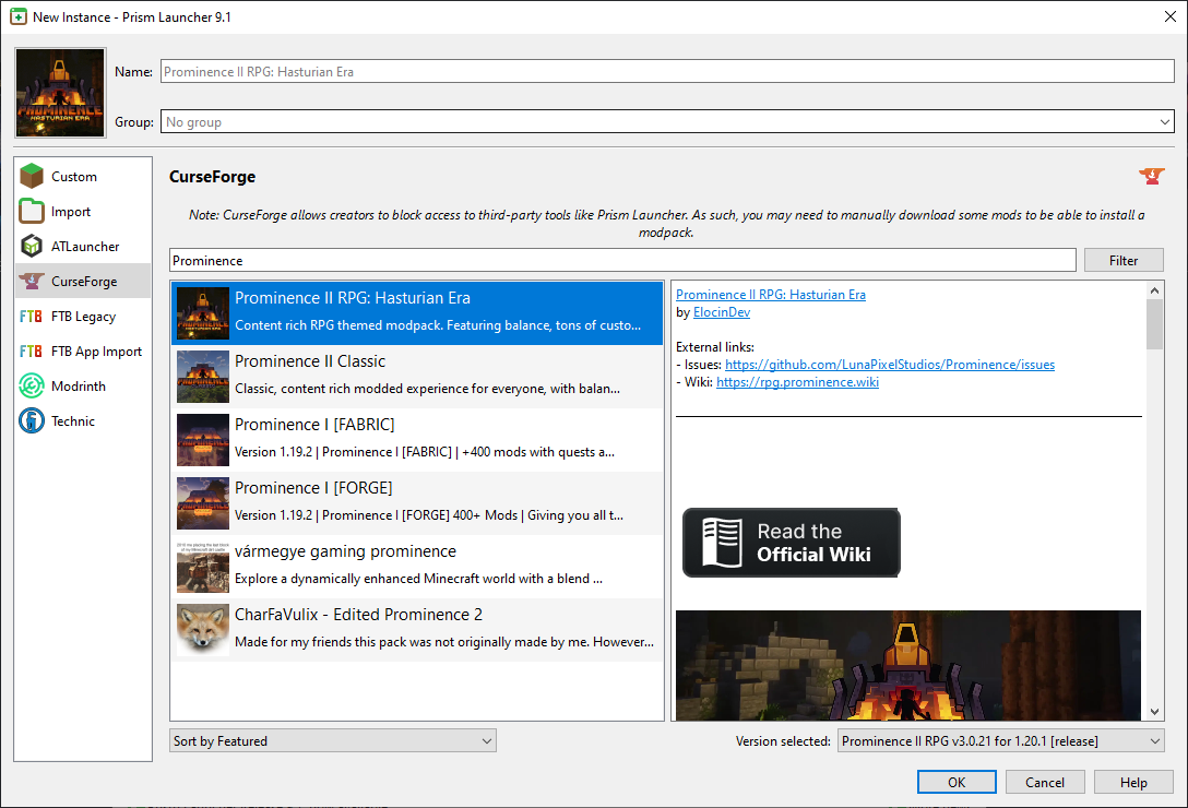 Click on 'CurseForge' and, in the search bar, search for "Prominence II RPG: Hasturian Era". At the time of writing, the latest version was v3.0.21, but if a new version comes out you may need to change the version to match this.